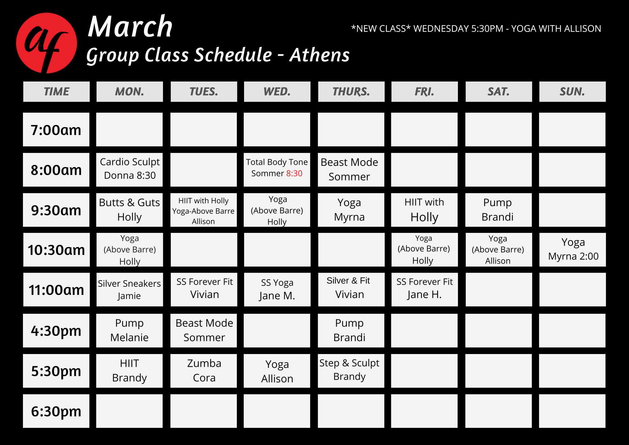 • People can sign up starting 30 minutes before class. Classes are on a first come first serve basis (no reserving spots, calling in, etc.)